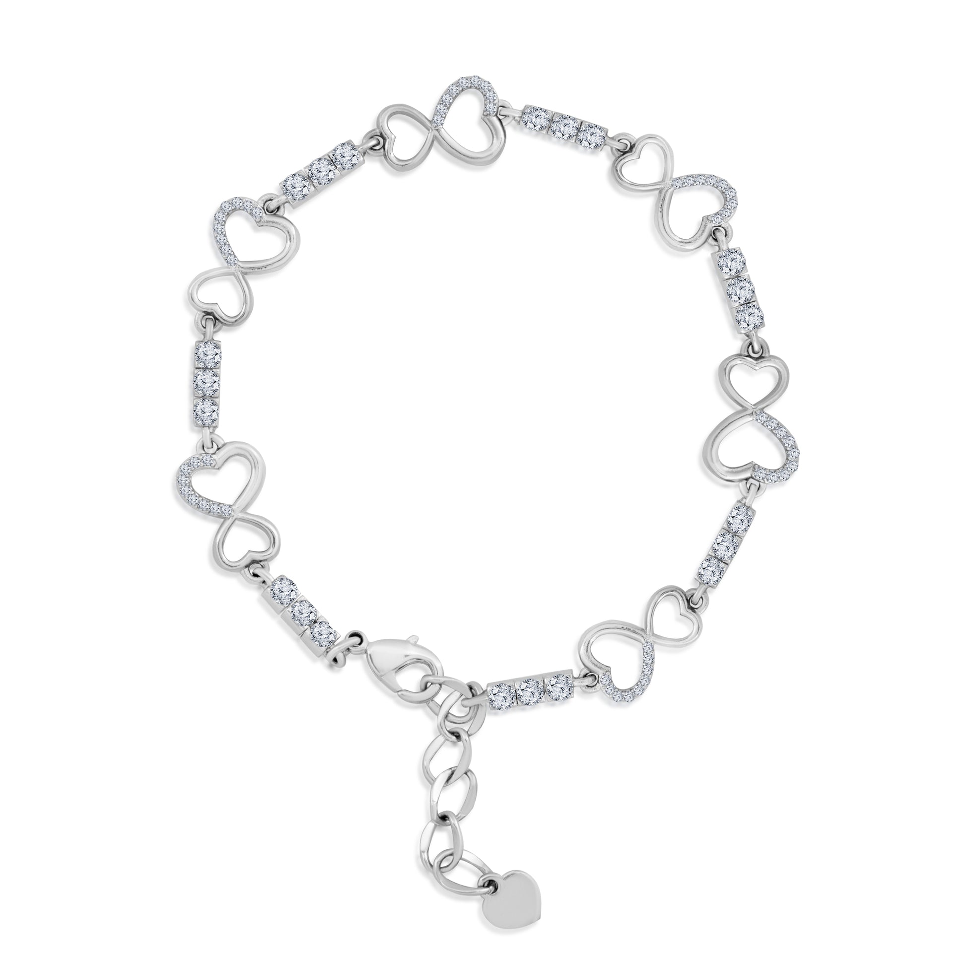 Amorette Heart Bracelet Delicately crafted with infinity-shaped hearts, the Amorette Heart Bracelet is a symbol of timeless love and refined elegance. Featuring a polished silver finish and intricate detailing, this bracelet is the perfect everyday accessory for the modern romantic. Carry your little love with you—always close to the heart.